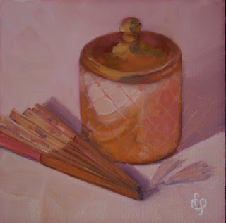 I started out painting "girl stuff" with the plan to switch subjects after a week, but here I am two weeks into it, and (a) I have lots more stuff and (b) I find the challenges of painting satin, velvet and animal prints, as well the decisions involved in rendering metal and glass (in the lipsticks and nail polish) to be most informative, demanding, and interesting. Before I started the daily-painting challenge, I sat down and listed over 200 subjects that I wanted to study in paint. One such challenge was sheer fabric, which I attempted above. Can you tell that some of the scarf is sheer, and other parts are overlapped?